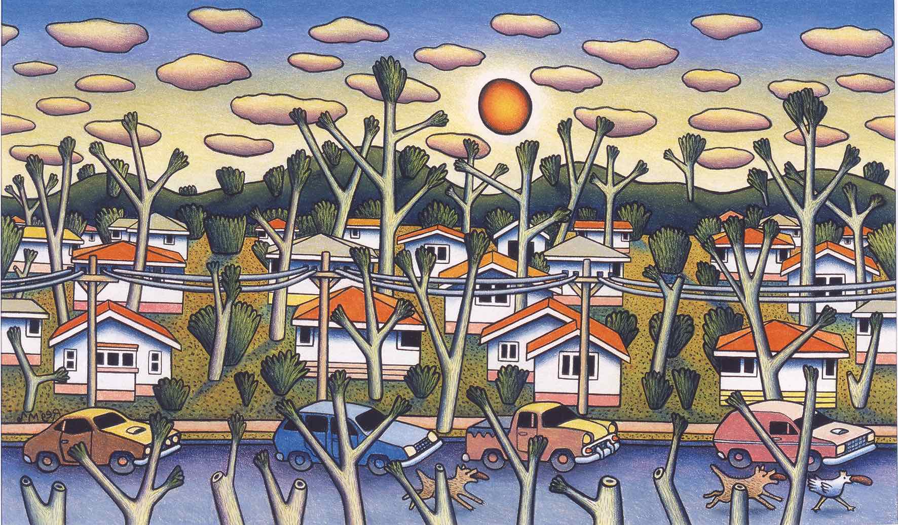 Bush Suburb – Charcoal and coloured pencil on paper, 26 x 44.5cm, 2000