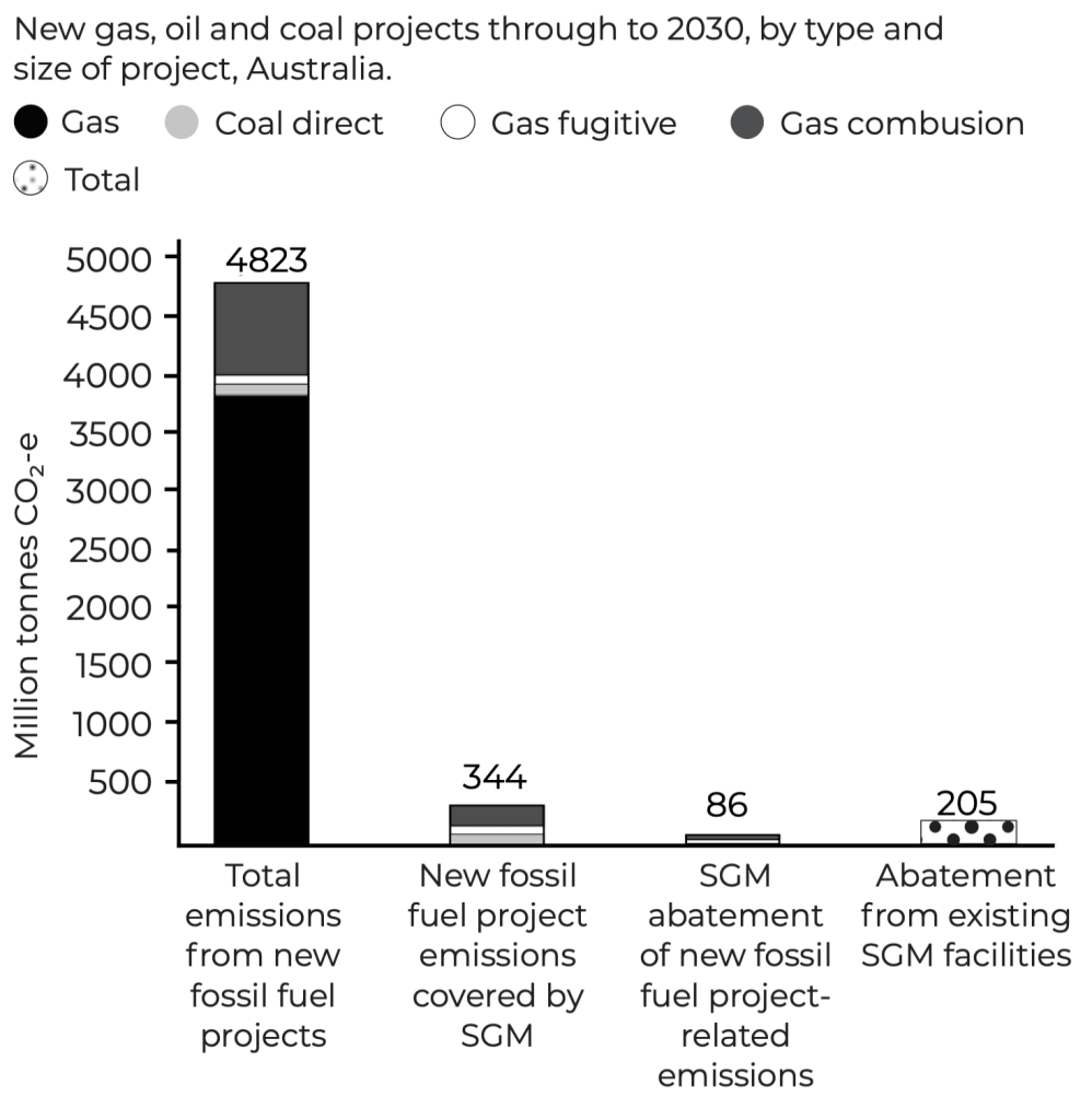 Second, even just the emissions in Australia from these 116 new fossil fuel projects (their methane leaks, fuel use and other relevant emissions) will pour 344 million tonnes of greenhouse gas emissions into the atmos- phere by 2030. That dwarfs the 205 million tonnes of emissions the entire SGM is supposed to save over that same period.