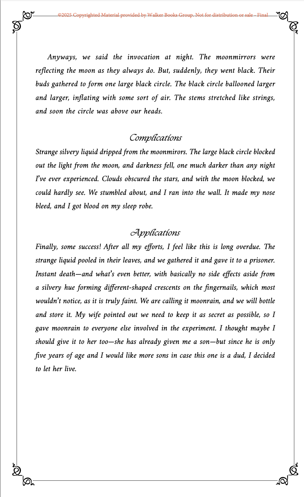 How strange it was to have someone grant you authority. In Radix, power was a limited resource for which everyone scrambled. Once secured, no one dared give it up or vest it in anyone else. I nodded, feeling thankful, confused, and awkward all at once. I switched my goblet to my other hand, determined to regain my composure and naturally move the conversation to Inessa’s death. Bizarrely, that seemed safer than whatever this conversation was.