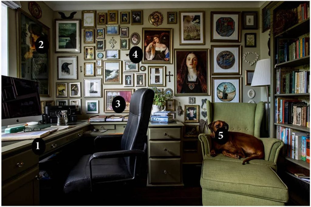 - My desk is where I spend most of my days. I painted it grintuition, growth, and creativity, and so my writing room has always been painted in this colour.